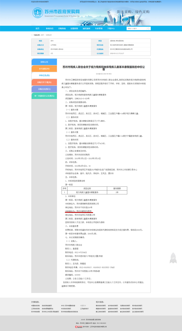 苏州市眼视光医院自2007年至今一直作为市政府残联的低视力康复工作的定点单位,服务广大视力残疾儿童。2018年4月8日,苏州市政府采购网上公示,我院在市残联“视力残疾儿童基本康复服务”公开招标中被评标委员会评审为中标单位之一。